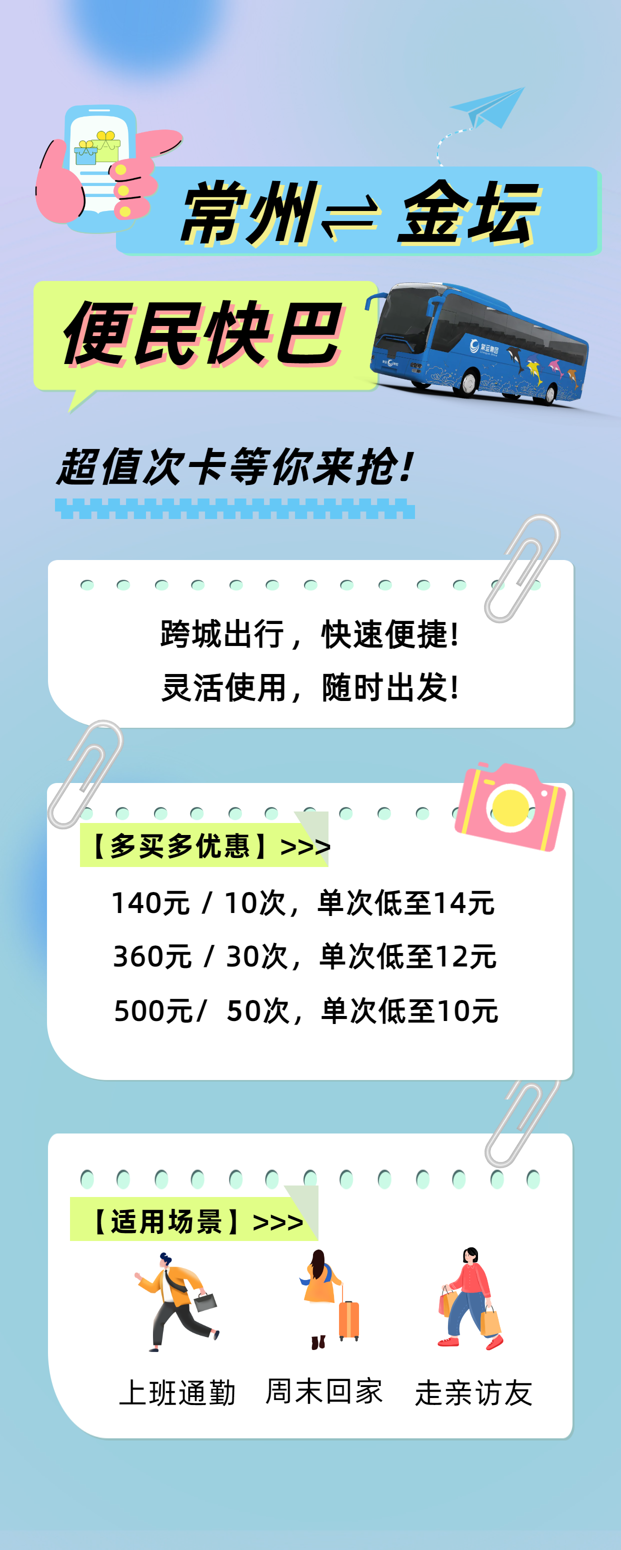 為進(jìn)一步提升出行體驗(yàn),常州至金壇便民快巴近日推出超值次卡,為廣大市民提供更加優(yōu)惠、便捷的出行選擇。此次推出的次卡共分為三檔:140元10次、360元30次、500元50次,具體購買及使用方式可關(guān)注“常州汽車站”公眾號(hào)了解詳情。